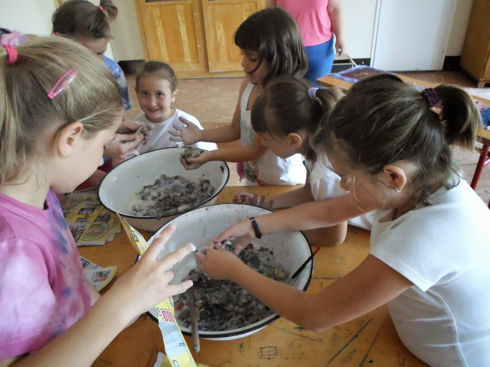Idén első alkalommal szerveztem tábort az alsós alkotóknak. Már tavaly is volt érdeklődés az alsósok részéről az alkotótábor iránt, így hát velük is belevágtunk. Hét kislánnyal minden nap kilenc órától délután egyig dolgoztunk az iskolában. Festettünk színes tussal, temperával, rajzoltunk színes ceruzával, zsírkrétával, csináltunk papírmetszeteket, amit aztán lenyomtattunk, s ha már ott voltunk a linófesték közelében, hát monotypiáztunk is. Merítettünk papírt, batikoltunk kötözéses módon pólót és terítőket, készítettünk mesékhez papírmasé figurákat, majd színházzá alakítottuk a cipős dobozt, és berendeztük benne a mesénket. No és minden nap játszottunk egy picit a játszótéren is, mert mint kiderült, azért el lehet ám ennyi festésben, rajzolásban fáradni! Közben Vona Szilvi tanárnő rendületlenül fényképezett bennünket-köszönet neki érte! A sok-sok fotóból most néhányat közzéteszek itt is. (Az összes kép látható az iskola facebook-ján):